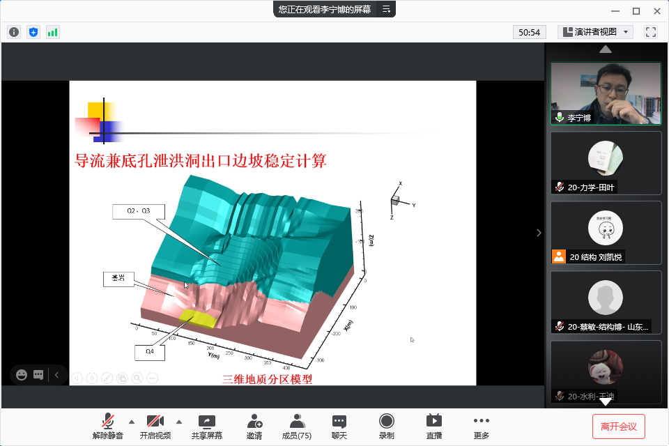 韩勃老师简单地介绍了李宁博老师的研究方向和最新成果后,李宁博老师便开始了本次汇报。汇报主要从四个部分展开:第一部分是背景和意义,李宁博老师给我们讲述了水利水电工程高边坡有边坡高陡、地应力高、地震频发等特点,也讲解了大家中国的地质灾害多发区主要以滑坡为主,每年均造成巨额生命及财产损失;第二部分是边坡变形稳定和失稳破坏分析方法,李宁博老师给我们讲述了岩坡破坏主要分为岩石崩塌、平移滑动、旋转滑移、岩块流动、岩层曲折以及各种类型发生的原因,也向大家介绍了高边坡抗滑稳定分析的一些方法,主要有刚体极限平衡法、数值流形方法、有限差分法;第三部分是国内某几个工程高边坡信息反馈,李宁博老师给我们介绍了几个典型的工程,并对工程的裂缝检测情况、边坡滑塌情况、开挖过程设计处理措施、左岸边坡地质条件进行了详细的讲解;第四部分是主要结论。