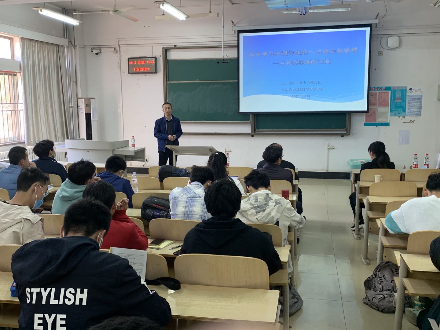 水利工程系邀请山东省水利科学研究院供排水技术研究所副所长刘健研究员以《关于学习水利专业的一点体会和感想—与学弟学妹的交流》为题,在兴隆山校区教学楼