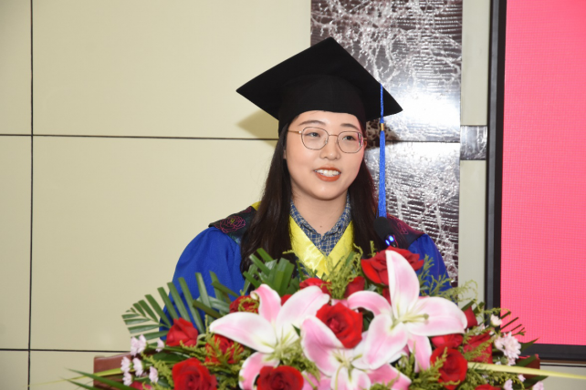 张越作为毕业生代表发言。她首先对学院的各位领导老师的辛勤培育表示感谢,表示定不负党和国家的期望,用行动为我们祖国的复兴事业贡献出自己的青春力量,不忘“为天下储人才,为国家图富强”的山大精神,成长为有责任、有胆识、有上进心的一代人。最后,她在对学院生活无限留恋与不舍的情感中,表达了对母校和老师们的诚挚祝福。