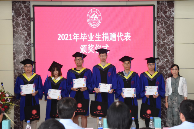 为国育贤、铸就梦想;捐资助教,弦歌不辍。为感谢2021届毕业生们自愿为学院捐款,典礼进行2021年毕业生捐赠代表颁奖仪式。辛帅为捐赠代表颁发证书并合影留念。