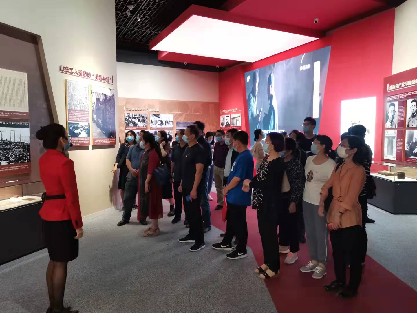 23日上午,参加活动的40余位党员教师来到山东省博物馆,参观“让党旗永远飘扬——山东省庆祝中国共产党成立100周年主题展”,开展“学习百年党史,汲取奋进力量”的主题党日活动。本次主题展览以1921年中国共产党成立以来四个重要历史时期为节点,集中展示了中国共产党成立一百年来特别是党的十八大以来,在党中央坚强领导下,山东各级党组织团结带领全省人民取得的伟大历史成就,是一部山东党组织在党中央的领导下的不懈奋斗史。一张张图片、一部部影音向世人们诉说着一代代山东人民在各级党组织的领导下努力拼搏,艰苦奋斗,争创辉煌的伟大事迹。在展厅内老师们一边听讲解一边通过一张张图片回忆着自己少时的情景,感叹山东取得的卓越成就。