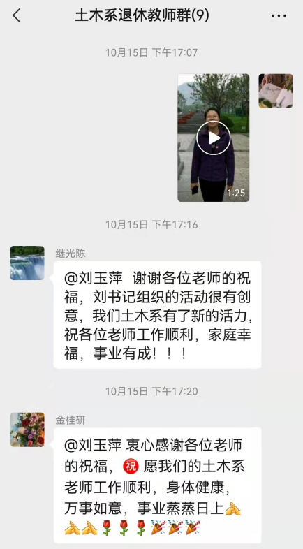 在淅淅沥沥的小雨之下,各位老师和学生登高望远合影留念并录制短视频向每一位退休教师“喊话”送上诚挚的慰问与祝福。土木工程系退休教师收到祝福后,反响积极,深受感动,对各位老师的祝福表示由衷的感谢。
