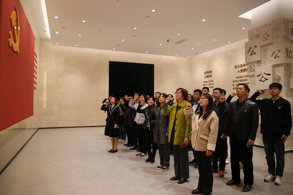 在宣誓厅,所有党员干部面对鲜红的党旗,重温入党誓词,进行庄严宣誓,感悟入党初心、进一步树牢为共产主义奋斗终身的坚定信念。