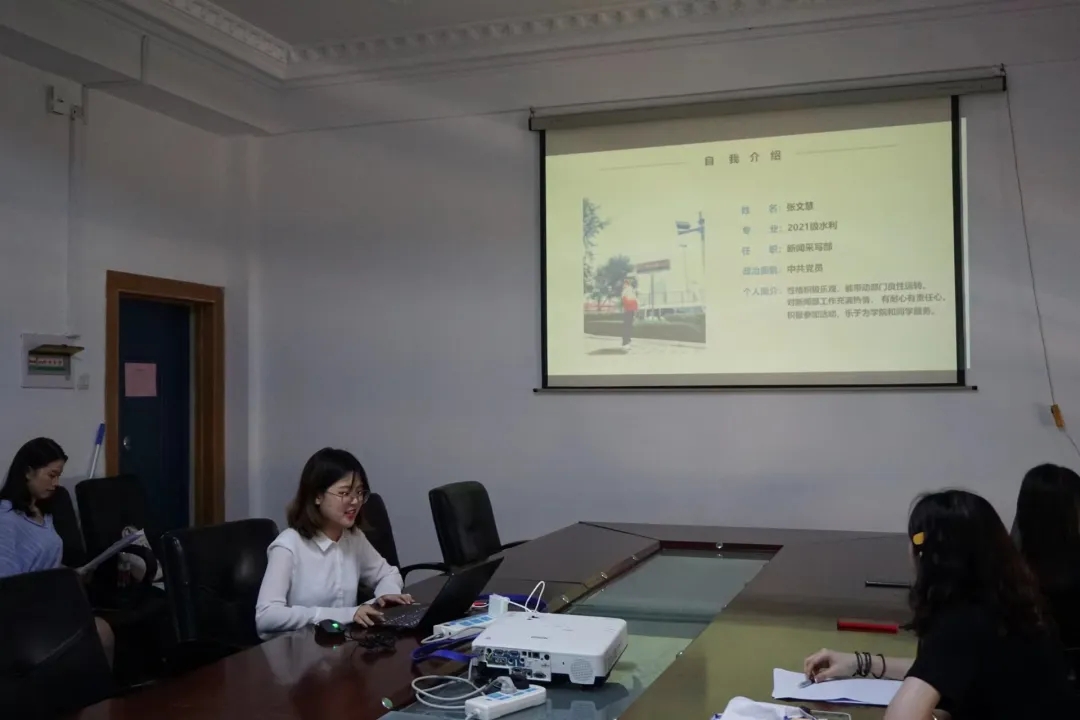 在水利楼第一会议室举行2022年研究生会换届大会,研究生辅导员姜海鹰出席了此次大会,与会的还有院研会主席团成员以及竞选候选人,院研会主席吕泊宁主持本次会议。