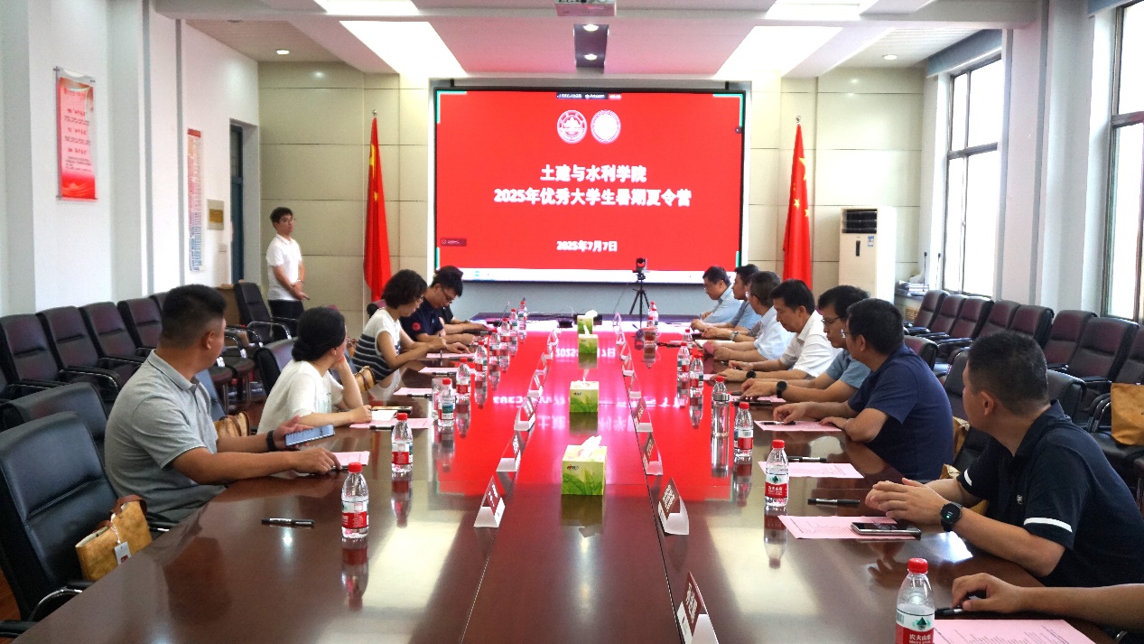 于千佛山校区水利楼211会议室举办2025年优秀大学生暑期夏令营活动,学院院长张庆松、党委副书记辛帅、副院长王少伟、各系主任以及优秀导师代表出席,副院长张强勇主持开营仪式。