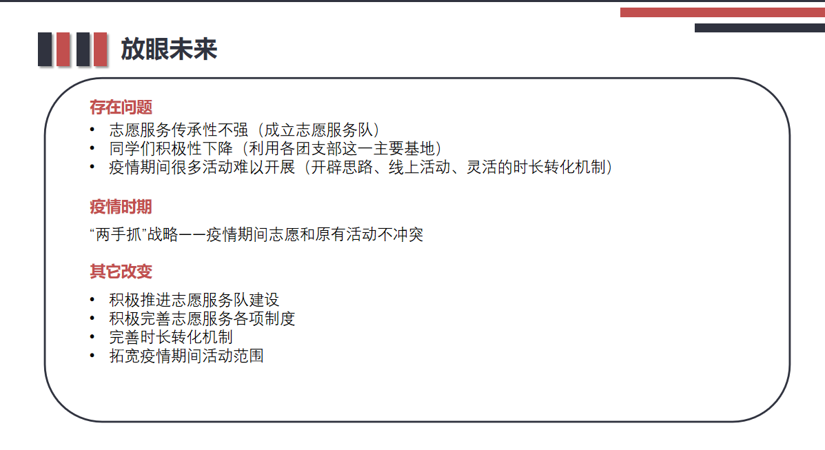 本科团支书参与。首先,主持人张瑞康带领大家回顾了志愿服务部上学期参与组织的历次校内志愿活动与校外志愿基地的运营情况,并对各团支部的积极配合表示了由衷的感谢。随后,大家聚焦当下疫情特殊时期举行的“战‘疫’情——土建学子在行动”系列活动,感受到了疫情面前土建学子投身志愿服务工作的不渝热忱。