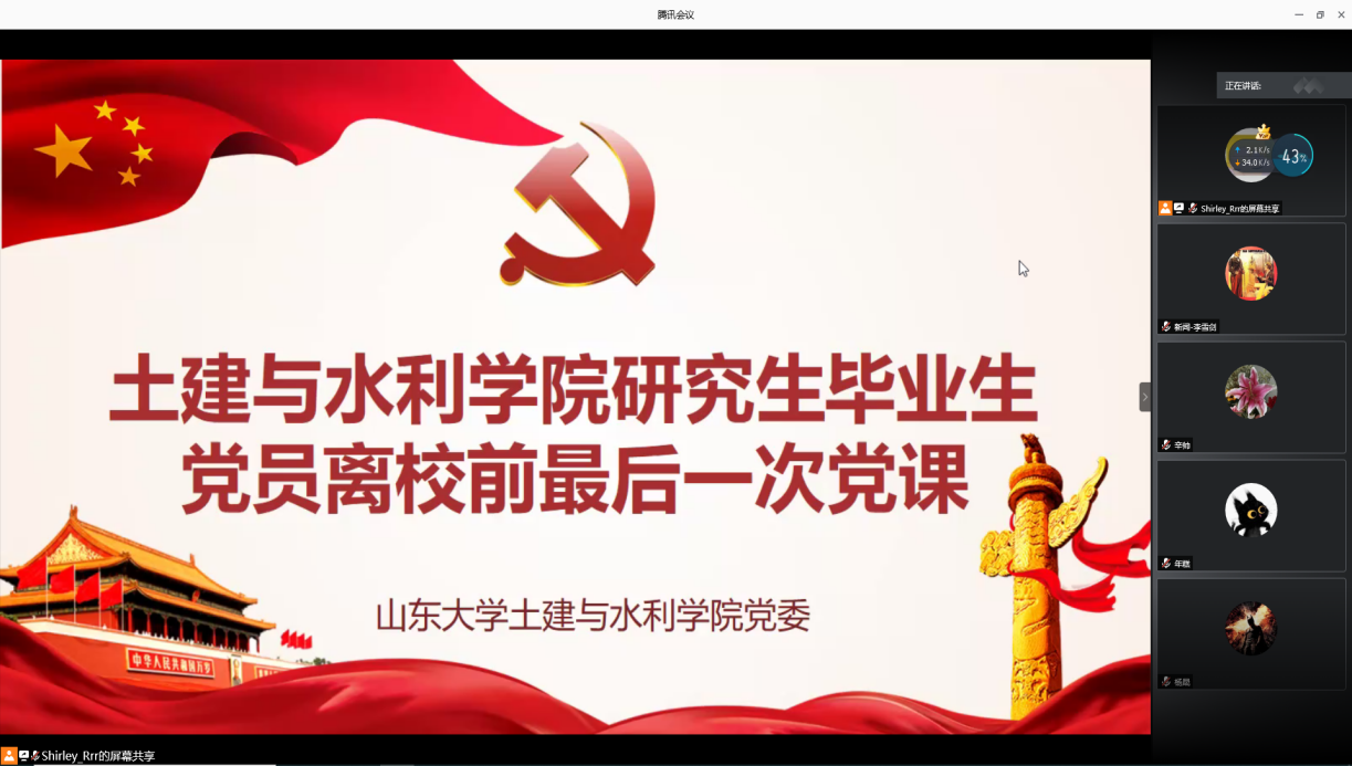 举行了研究生毕业生党员离校前最后一次党课。学院优秀校友冯明耀和党委书记胡岩分别讲授了党课,学院党委副书记辛帅主持,学院全体2020届博士和硕士毕业生党员参加了党课学习。