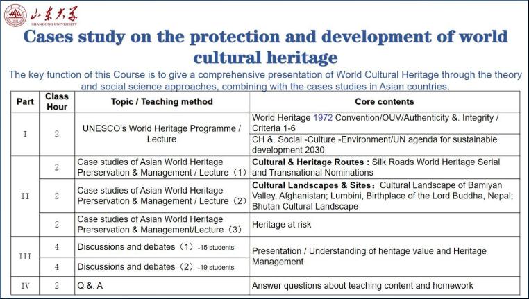 暑期海外师资项目“世界文化遗产保护与发展国际经验解析”[SQ0000202H]顺利进行。本次暑期课程包括四次讲座、 两次交流讨论和一次答疑环节。课程由联合国教科文组织(UNESCO)法国总部世 界遗产中心专员 Roland LIN 教授主讲,吃瓜网