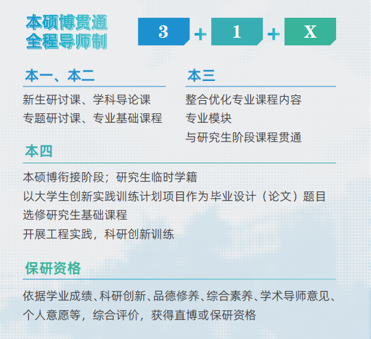按照“3+1+2/4”本硕/博贯通长学制培养。前三学年集中开展通识、学科基础和专业核心课程学习,第四年进行本硕博衔接课程学习。第四学年末,达到本科毕业要求的,依托所选修专业模块,获得相应的本科毕业证书和学士学位证书。第五学年开始转入研究生学习阶段;硕士研究生的基本学制为2年,博士研究生的基本学制为4年。