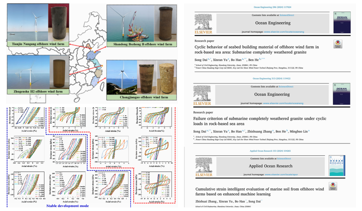 我国海上风电工程发展迅速,累积装机容量39.1GW,占全球总装机容量51%。基础建设约占海上风电场总投资的30%,海床材料物理力学性质是海上风机基础设计的核心要素。该系列研究重点聚焦于岩基海域海上风电场海床材料在长期循环荷载作用下的动力响应特性,分析了全风化花岗岩力学性质的独特性,提出了全风化花岗岩循环破坏准则,建立了增强机器学习累积应变预测模型,确定了岩基海床海上风电场基础核心设计参数,为海上风电场基础设计和建设提供了重要参考。