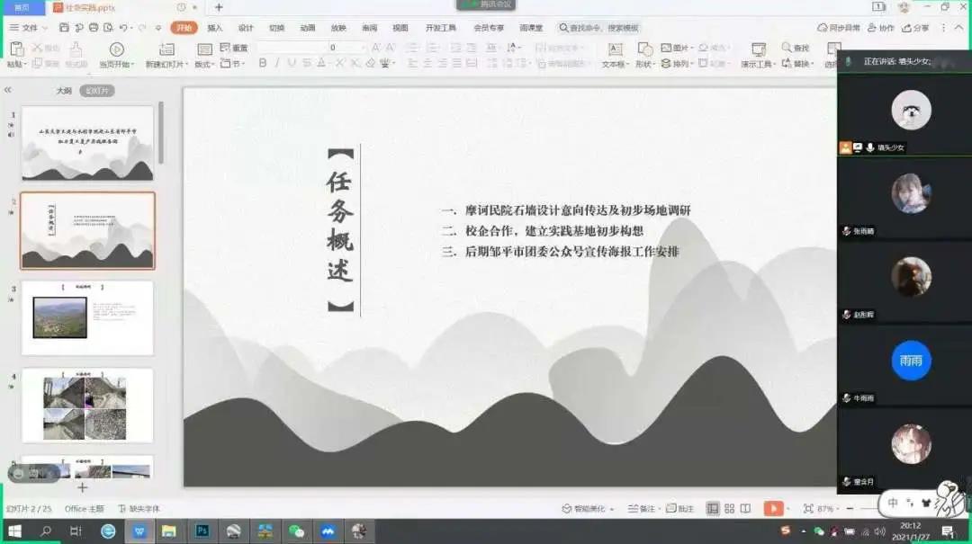 在会议上,队长向队员们详细传达了以上摩诃民院石墙设计意向及场地调研结果,队员张雨晴进一步分析此次设计主要的受众群体为年轻人,进一步帮助团队明确设计风格,其余队员积极发表了自己的看法和观点。