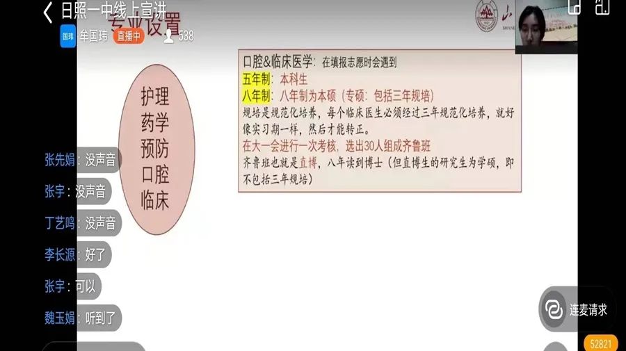 母校宣讲活动山东省448队成员宋金诺参加筹备了近一个月的宣讲活动。受疫情影响,本次活动以线上形式展开。宣讲团成员积极准备,热情介绍;宣讲对象主要面向高三学子。活动中有500多名家长和同学持续在线观看。