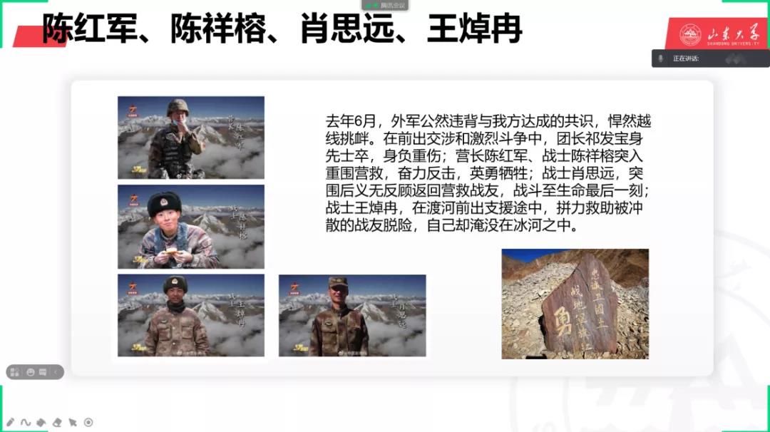 活动完成后,第二党支部通过线上学习形式追思英烈。党员们浏览济南战役纪念馆官网了解历史、缅怀前辈;观看新闻学习英烈精神;组织学习近期中印边境冲突中牺牲的陈红军、陈祥榕、肖思远、王焯冉四名解放军战士和在马里共和国遭遇恐怖袭击而牺牲的申亮亮战士等光辉事迹,增强责任意识。
