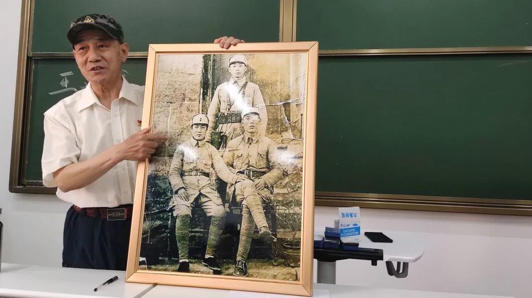在正式展开讲述前,王速成老先生首先向同学们进行了简单的自我介绍。王速成,今年68岁,是一名50年党龄、当兵22年的老党员、老干部、老战士。王速成老先生出生于一个红色家庭,父母都是山东抗日战场中的英雄。谈到家庭,王老先生向同学们展示了战争时期他的父母与他父亲的警卫员的一张三人合照,并动情地讲述了自己家庭震撼人心的红色故事。在家庭传承革命传统的使命之下,王老先生走上了红色宣讲的道路。他十分激情地讲到:“中国不缺故事,不缺英雄,缺的是像我们这样的红色宣讲人!”