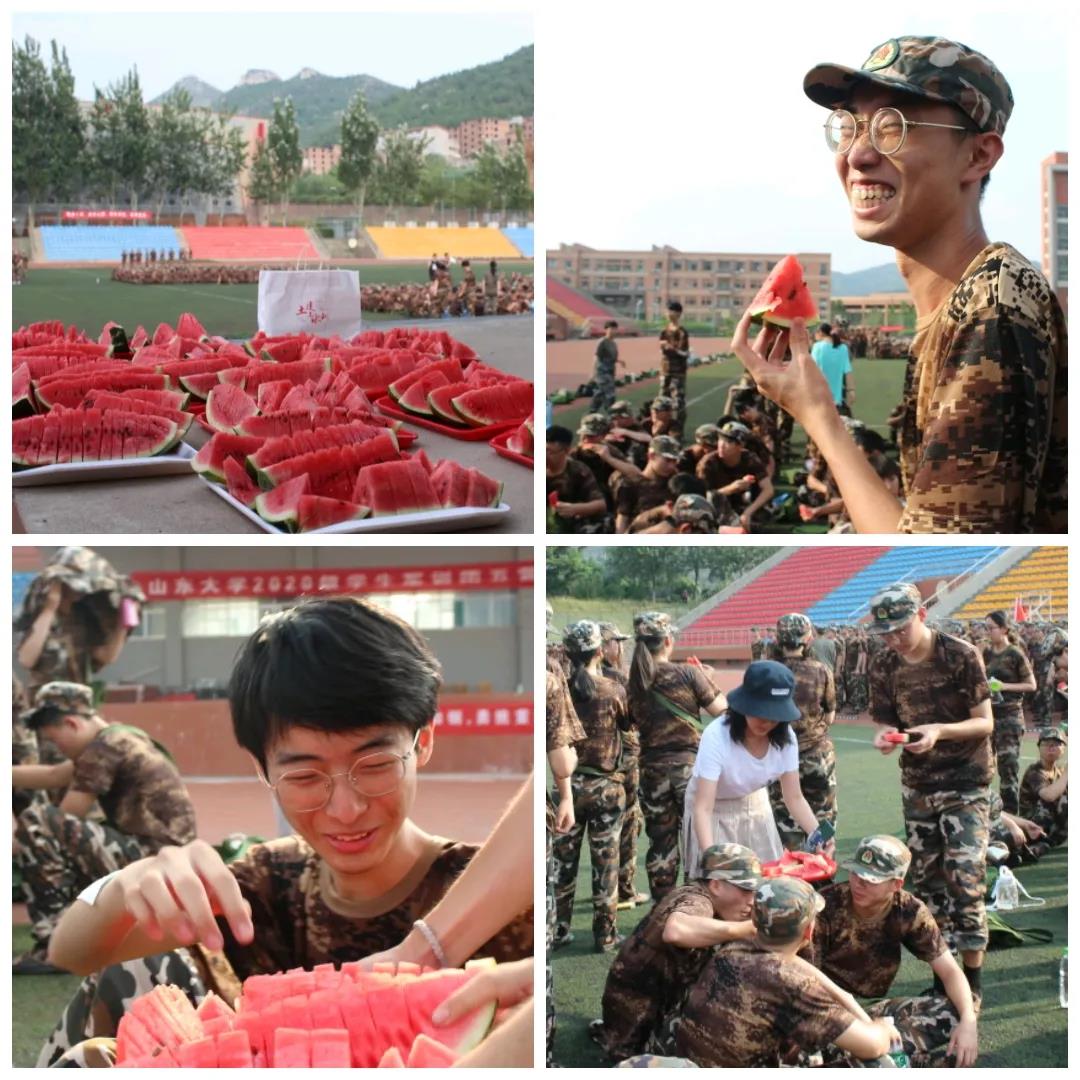 贴心为军训成员准备花露水、风油精、藿香正气水等防暑物资,并分发绿豆汤、西瓜进行解暑。当学生们拿到西瓜,炎热的风雨操场上瞬间清凉起来,他们的笑声传遍兴隆山。在休息时间内,同学们拉练军歌,声音洪亮,气势豪迈,展现出的满腔热血与昂扬斗志。