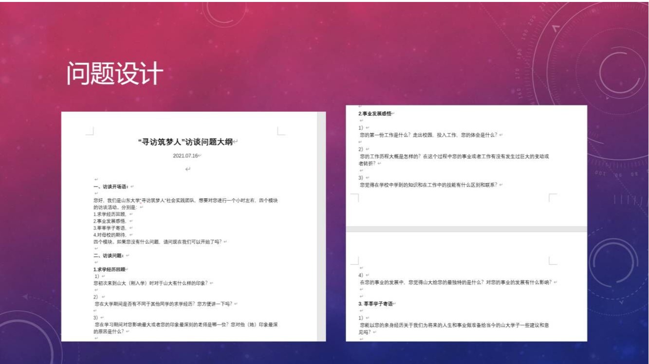 随后,团队各成员共同讨论与设计了采访问题,形成统一的问题大纲。各专业成员在后期的采访过程中将在此大纲的基础上 结合学科特点形成更具特色和针对性的采访。戎雅惠还在会议上强调了实践中的注意事项,如采访前期的沟通协商问题、实践过程中的礼仪问题、形成与保存好采访文字稿等等。