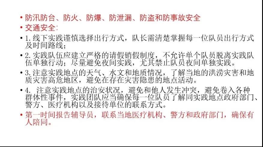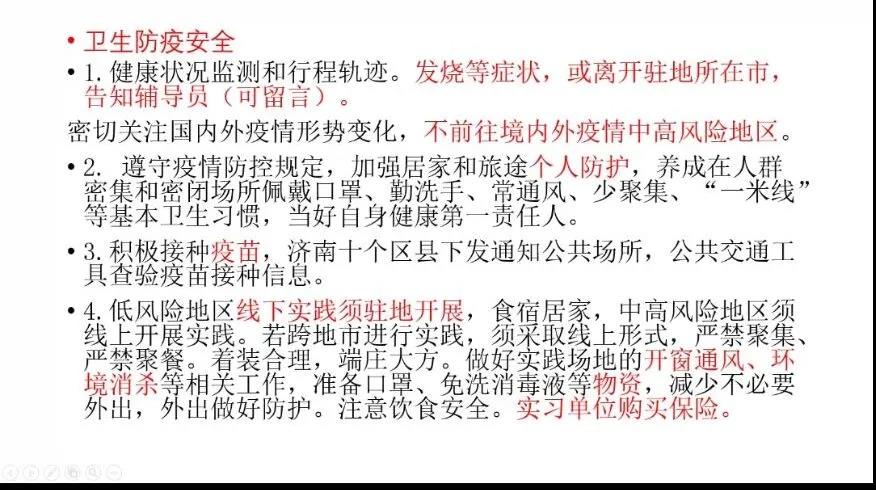 此外,梁莹对同学们重点讲解了社会实践安全问题。她指出,在社会实践中,团队成员需汇报健康状况监测和行程轨迹,如有发烧等症状或离开驻地所在市需告知辅导员。同时,在社会实践过程中,应遵守疫情防控规定,加强居家和旅途个人防护,当好自身健康第一责任人。梁莹指出,低风险地区线下实践须驻地开展,食宿家中,中高风险地区须线上开展实践。若跨地市进行实践,须采取线上形式,严禁聚集。另外,若社会实践涉及实习,应要求实习单位提供保险。