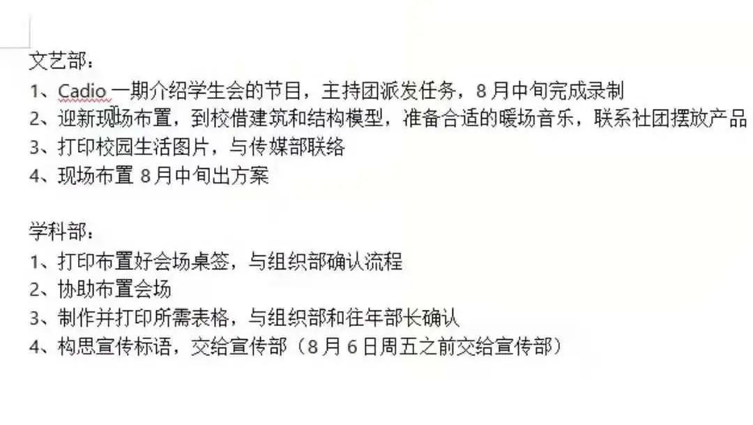 特色与迎新主题,帮助新生快速熟悉校园环境。体育部负责现场志愿者后勤准备工作;文艺部与学科部共同负责迎新会场布置;传媒部负责线上迎新与新闻记录;宣传部与网编部负责迎新宣传工作;实践部负责暑期社会实践活动工作,志服部负责迎新现场志愿者招聘与管理,秘书处负责迎新用品准备与管理,组织部负责新生入学流程安排。