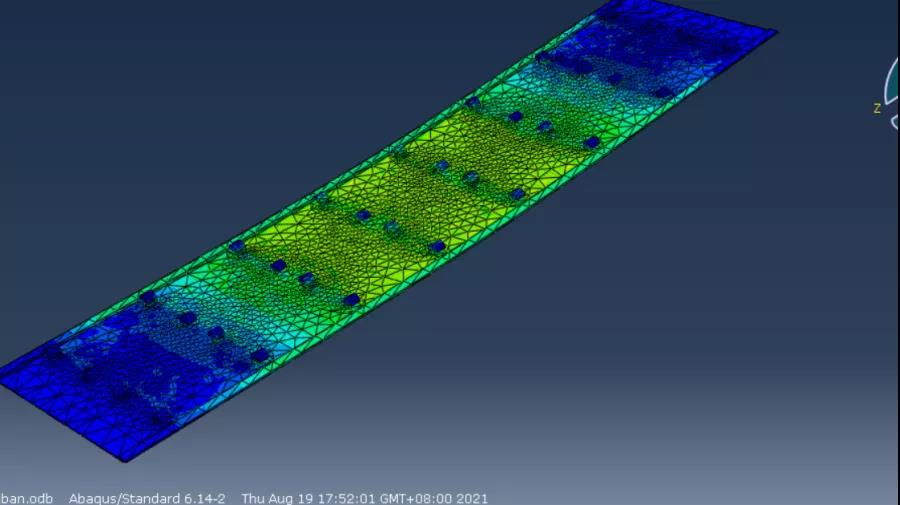 会上,阎相君展示并讲解了ABAQUS对该模型的详细分析步骤,使用ABAQUS自由网格对底模进行网格划分,然后简单地对PVC底模进行加荷模拟,得到底模的应力云图。