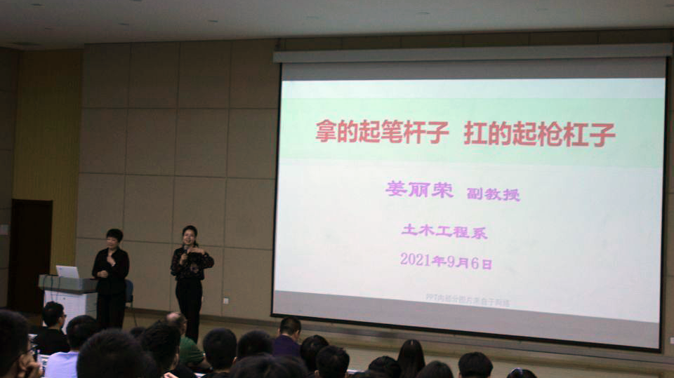接着,姜丽荣以“拿得起笔杆子,扛得起枪杆子”为题,以“古建筑为什么会长寿”引起同学们的兴趣,结合多个视频资料与所举出的具体案例和结构讲述土木工程与古建筑的联系,并鼓励同学们学习土木工程系来将古代建筑智慧应用并发扬到现代建筑中。在最后,她给同学们提出忠告,要记得学习的初心,为实现自我的价值而不断努力。