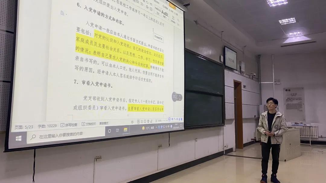 之后,第一党支部组织委员张瑞康就“如何从思想及能力上向党组织靠拢”进行讲解,并从爱党爱校、全面发展、实践成长、青年责任四大方面对新生给予期待。他以优秀学长刘胜琪为例阐述了高效利用时间对实现全面发展的必要性,他说,中国人总是被他们之中最勇敢的人保护得很好(基辛格《论中国》),并激励新生成为“最勇敢”的那一个。