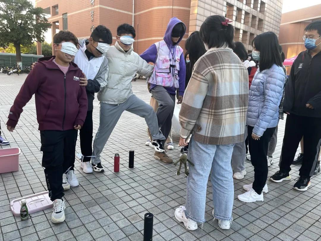 在活动中,同学们蒙住双眼、绑住双脚,只管将方向和目标交给值得信任的同学。不知不觉间,增进了相互信任。同学们相互合作,借助团队的力量,为着同一个目标而共同奋斗,同时也体会到团队精神的力量。活动现场,欢呼、笑声和场下观众的助威声此起彼伏,整个活动充满了欢声笑语。