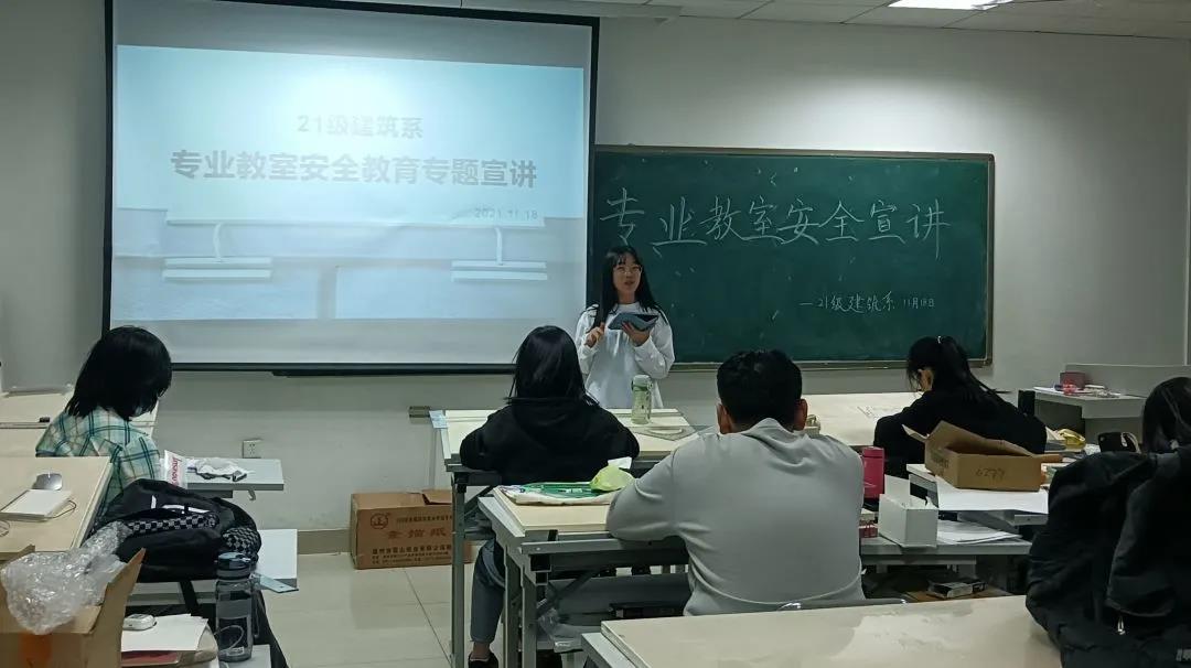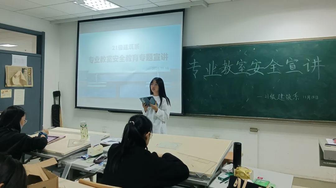 2021级建筑学系一班和二班于实验楼专业教室共同开展专业教室安全宣讲,本次宣讲由两班班长组织,2021级建筑学系全体同学参加。