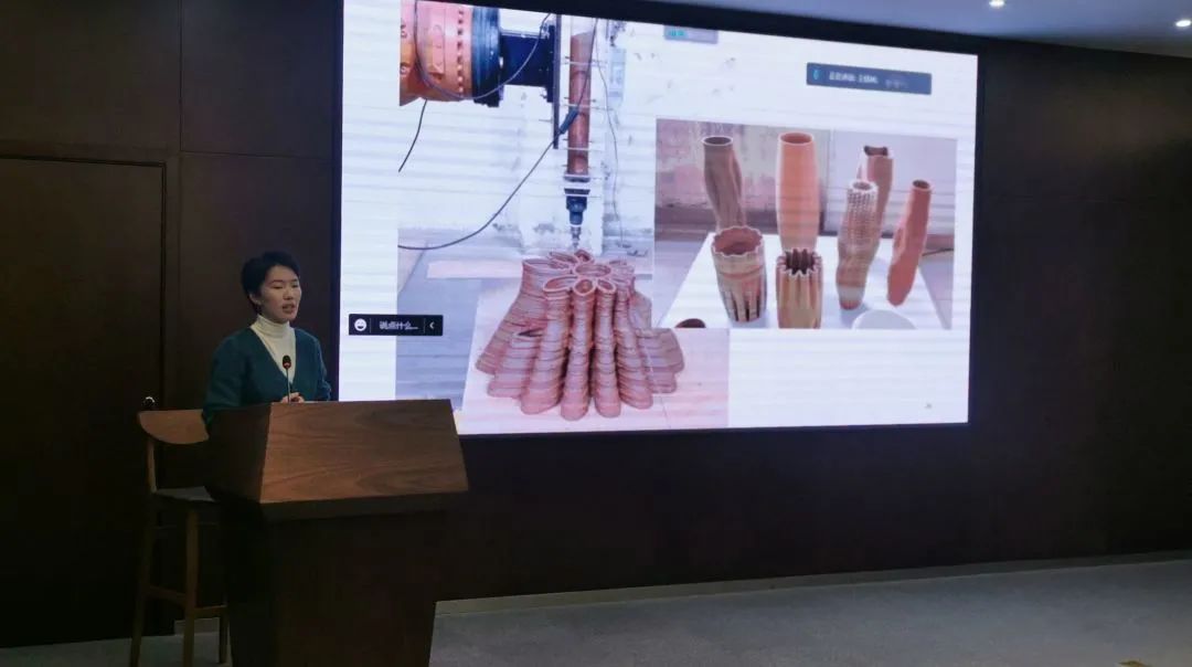 分享会伊始,王钰林向大家介绍了自己的一些研究尝试,包括碳纤维家具制作等个人小项目和机械臂大尺度3D打印生产和金属打印节点优化的实习大项目。她也分享了自己刊登在《2021全国建筑院系建筑数字技术教学与研究学术研讨会论文集》的毕业论文——《展厅建造中机械臂层叠式3D打印方式的研究》。