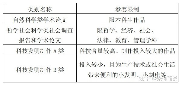 参赛作品分为三大类:自然科学类学术论文、哲学社会科学类(含哲学、经济、社会、法律、教育、管理)社会调查报告和学术论文、科技发明制作。