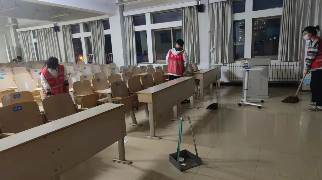 开展教学楼清扫志愿服务活动。活动主要内容为教学楼地面清洁和桌椅垃圾清理,旨在疫情封校期间为在校生提供清洁的自习环境,减少留校职工工作压力,确保封校期间卫生保障工作有序开展。