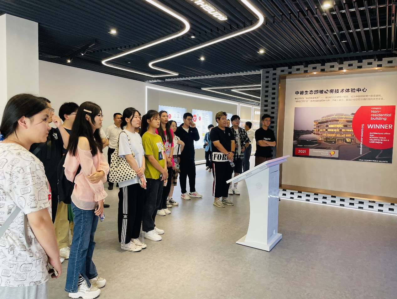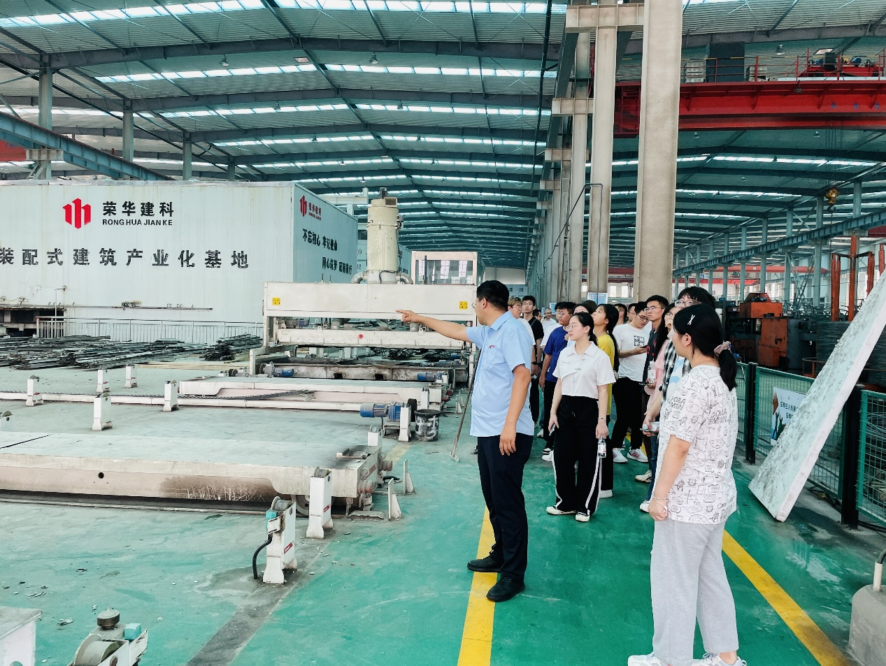 参观工程项目,实现学以致用。在荣华建设集团副总工程师兼研发部总监李海生和董事长秘书、办公室副主任周琳翔的陪同下,“荣华班”成员先后参观中英商贸酒店、中德生态园被动房体验中心、万科城望云起项目等集团项目。同学们在中英商贸酒店和中德生态园被动房体验中心,亲身体验到恒温恒湿恒氧恒洁的舒适环境,跟随项目负责人学习被动式超低能耗建筑的原理、先进技术和施工细节,树立绿色、节能、环保建筑的意识。同学们进入万科城望云起项目施工现场,通过建筑内部的建造细节了解装配式建筑技术。随后“荣华班”成员参观了荣华建科装配式工厂,深入了解装配式建筑构件的加工过程和养护过程,让同学们对装配式建筑从无到有的全环节有了整体的认知。