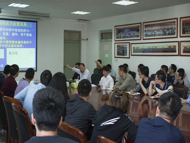 郑院士首先由弹塑性力学基础理论知识,引出弹塑性材料受力的三个阶段—弹性状态、塑性状态、破坏状态—及受力过程中所遵循的屈服准则与破坏准则。基于材料破坏的定义与材料破坏的过程,他讲到了破坏函数、破坏面以及三种不同的破坏条件:屈瑞思卡破坏条件、米塞斯破坏条件、莫尔-库仑破坏条件等与材料破坏密切相关的内容。随后郑院士又以混凝土为例,向在场的师生讲述了如何由其强度求极限应变的方法,即通过建立计算模型、划分大量单元体、试件受力试验,再利用计算机软件模拟可以得到某单元面贯穿导致整体破坏,那么该单元应变即为极限应变。结合大量的实例,郑院士详细介绍了极限应变法在边坡、隧洞、钢筋混凝土结构、钢结构中的应用。最后他认为经过不断的实验与研究,无论是计算材料安全系数与结构极限承载力、进行材料抗拉强度试验及混凝土应变监测等,通过极限应变法得到的计算结果与实验结果相差甚小,与利用其他传统方法得到的计算结果也比较相符,总而言之极限应变法是一种可靠的、值得大家积极研究的方法。