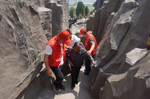 之后,工作人员带领队员们前往青山景区,参观当地志愿服务点。穿过美丽的绿荫小道,队员们一行人来到当地旅游胜地——青山。队员们在各个较为危险的路段、较为陡峭狭窄的石梯、各个主要旅游景点都发现了身着红马甲、头戴红色遮阳帽的志愿者。他们热情主动地进行服务,帮助老人、怀抱婴儿的旅客登山,为不熟悉环境的旅客指路、引路,为口渴的旅客提供免费开水,还帮助入庙祈福的旅客看包等等,为青山景区营造了一个温暖的人文氛围。
