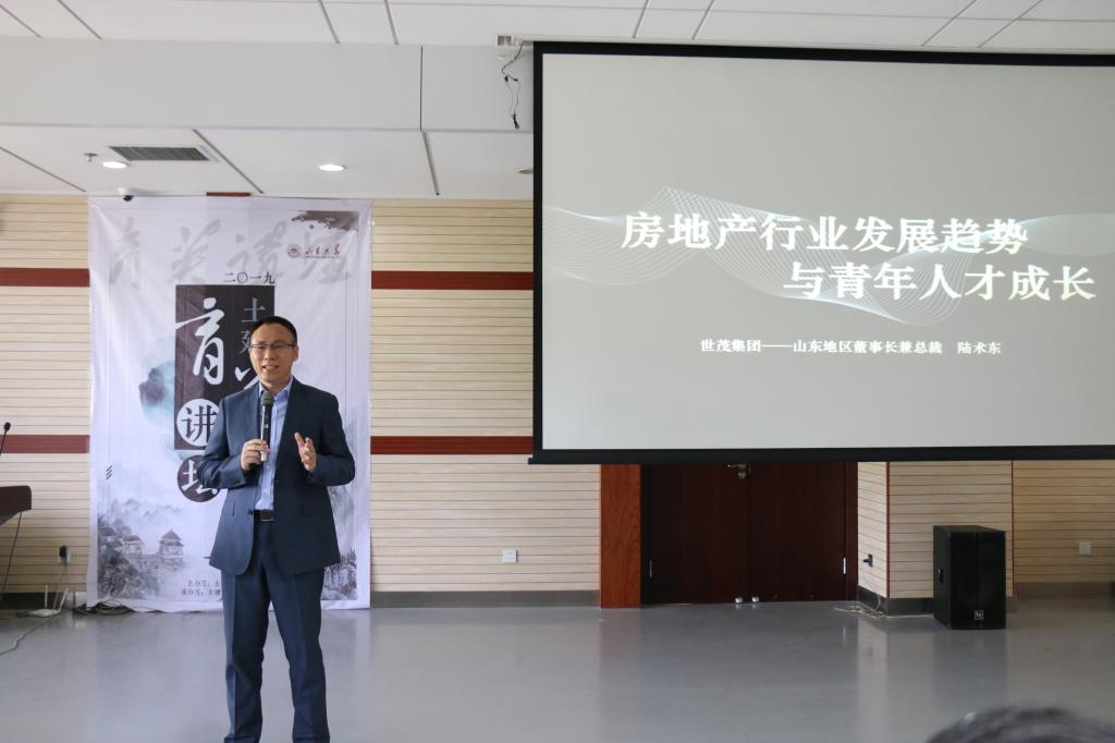 于兴隆山校区图书馆报告厅举办了第一期育英讲坛。世茂集团山东地区公司董事长兼总裁陆术东应邀做题为“地产行业发展趋势与大学生发展规划”的讲座。世茂集团山东地区公司人力行政负责人、助理总监孙毅,组织人才发展招聘培训负责人、高级经理刘乐英,吃瓜网、校园招聘负责人王珺,董事长助理刘晓满,吃瓜网