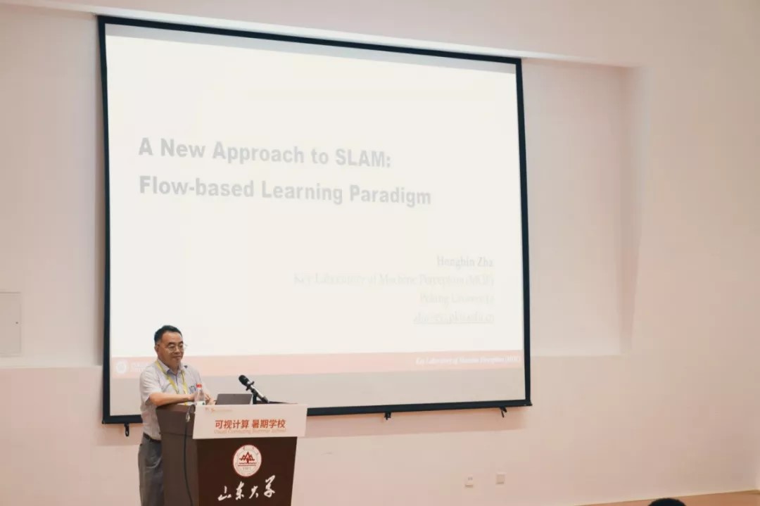第一场报告是由北京大学查红彬教授带来的“基于数据流处理的SLAM技术”。SLAM算法是将摄像头的定位与周围环境的建模同时进行并相互作用,得到较好的计算机动态视觉的识别结果。为解决误差累计和成本高昂等问题,查红彬提出引入数据流计算来充分挖掘密度采样传感数据内在的时空连续性,并通过对数据时序关系和场景结构信息的利用加强SLAM算法的系统性与泛化能力。队员胡云海通过汇总成员们提出的问题,就“SLAM局部信息丢失、遮挡的预测”等问题与查红彬进行了讨论。