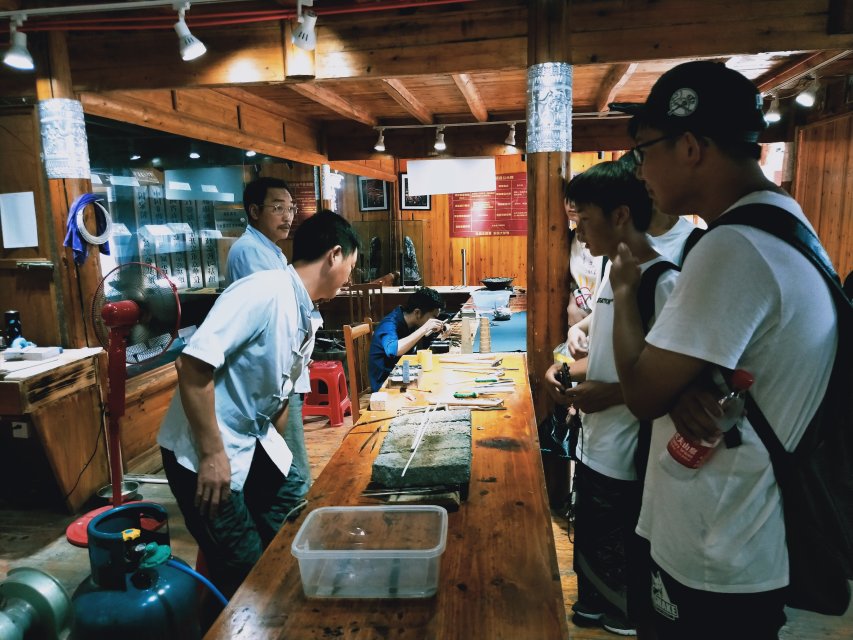 下午,团队赴三苗匠艺苗族银饰博物馆对景区内的居民经济模式做了进一步调研。苗王城是国家银饰锻制技艺传习基地、矿石资源有序开发重点单位、贵州省农村产业创新示范基地、中国非物质文化遗产展示基地,同是也是国家精准扶贫实验基地。可见,当前旅游业的发展虽然在一定程度上带动了当地经济,但距离全体脱贫仍有一定距离。据悉,苗王城内并无银矿资源,苗族的银饰原料虽依托国家的直接免费提供,经苗族传统锻造技术雕琢,形成成品销售。景区内村寨中80%以上劳动力从事银饰的锻制与销售,男性一般负责锻造,从师门和父传子两种方式传承技艺,三年可出师,景区内共设三个加工点,简单器物一日可成,复杂者三日以上不等;女性多从事银饰销售,文化水平多为中学阶段。银饰销售盈利部分需供景区内全体村民开销,当地经济仍存在较大压力。