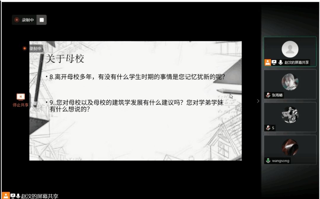 “再话芸窗”社会实践团队通过腾讯会议对建筑学系校友王嵩进行个人专访。此次会议由赵汶主持,实践团队三名队员参加。