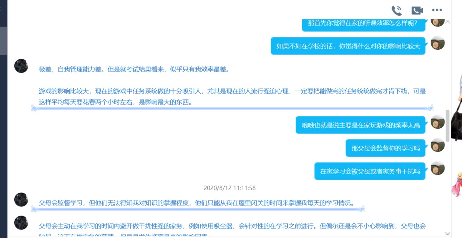 结合前一次采访,调研组后续讨论分析认为,线上学习并不适合普通的、自觉性不够高的同学。高考延期对于同学们的心理有影响,但影响并没有很大。同时,针对受访学生的经验分享得知,线上的按时预习,及时复习更为重要,同时要懂得利用线上授课可以回放的优点,及时查漏补缺。