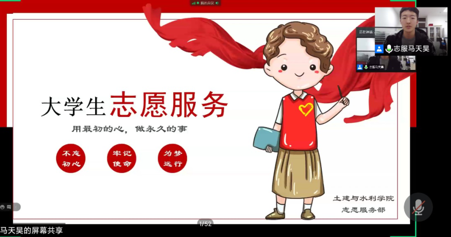 学生会主席张瑞康,2019级志愿服务优秀个人张世榕同学,以及2020级全体同学参加本次会议,志愿服务部部长马天昊、马湛涛,文艺部部长田云汉共同主持本次会议。