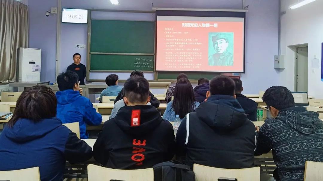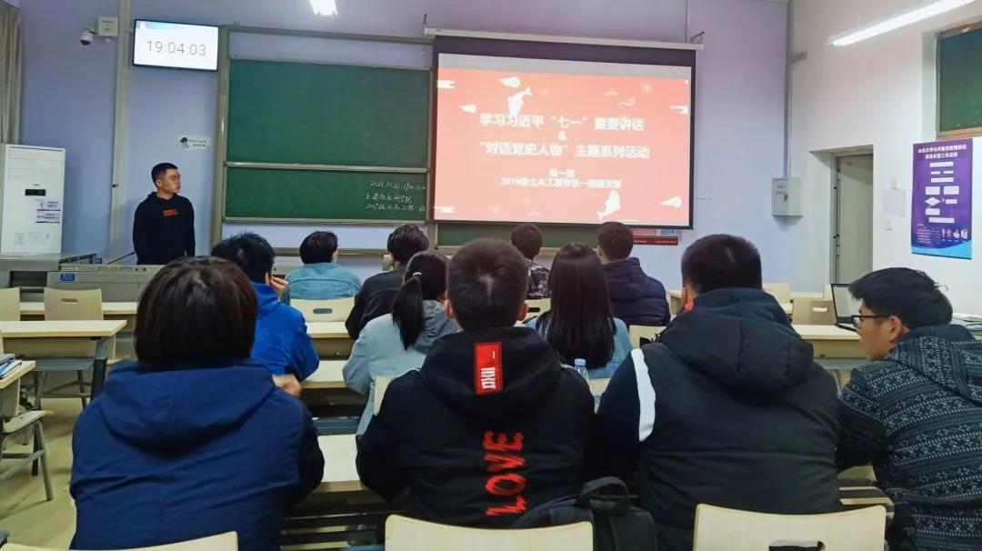 2019级土木一班于教学群楼1102开展秋季学期第一期主题团课活动,活动主题为——学习习近平“七一”重要讲话、“对话党史人物”。本次活动由团支书陈文东主持,土木一班全体团员参加。
