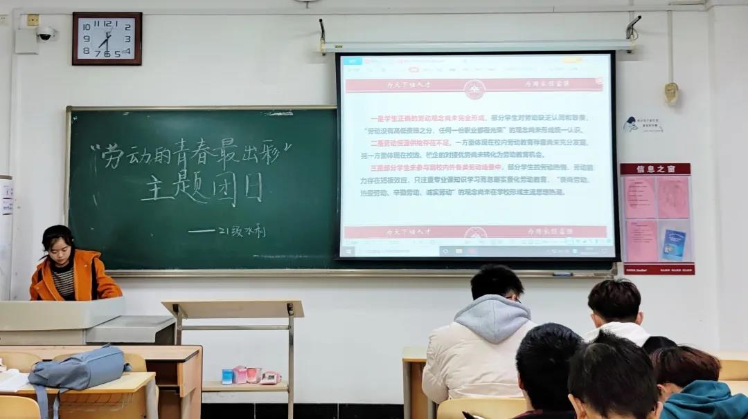 2021级水利系于教学楼1203教室开展“劳动的青春最出彩”主题团日活动。本次活动由团支书杨思莹主持,2021级水利系全体同学参加。