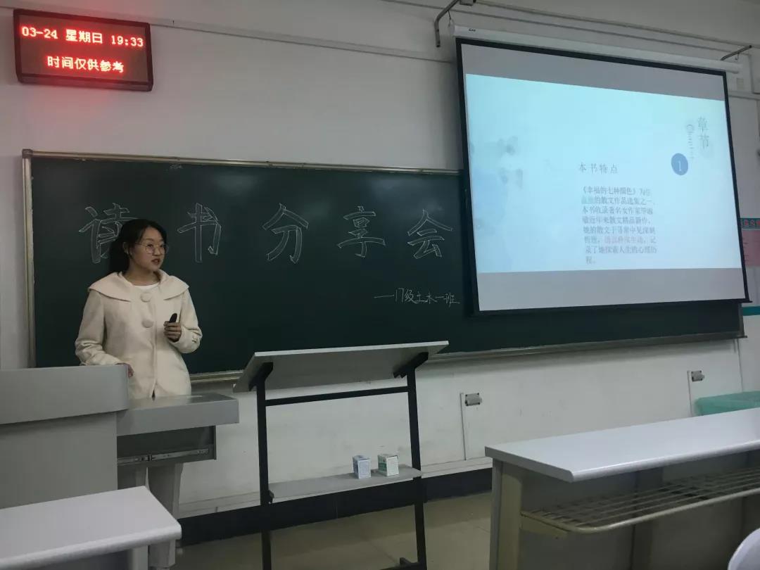 晚7点半,活动正式开始。作为第一期读书分享会的主讲人,吕玥以PPT的形式,从书籍特点、作者介绍、精彩展示、读后感受四个方面为班级同学详细解读了毕淑敏的散文作品《幸福的七种颜色》。她提出,《幸福的七种颜色》一书用朴实的语言,结合平凡却不琐屑的故事,真挚地传达出真、善、美的思想,作者毕淑敏对人的关怀和热情悲悯之心也在此书中得到淋漓尽致的展现。谈及读这本书的契机和感受,吕玥表示,一开始她是被这本书的“颜值”所吸引,随后被书的内容深深打动,“7”是一个神秘的数字,西方有七种美德,甚至有七宗罪,我国佛教中也有七级浮屠之说,在古文中,“7”代表多,因此说幸福有七种颜色,实际上指幸福是无限且绚烂的”,最后,吕玥结合书中主题激励在座同学“不要时常陷入悲观,要知福并且要善于发现属于自己的幸福”。