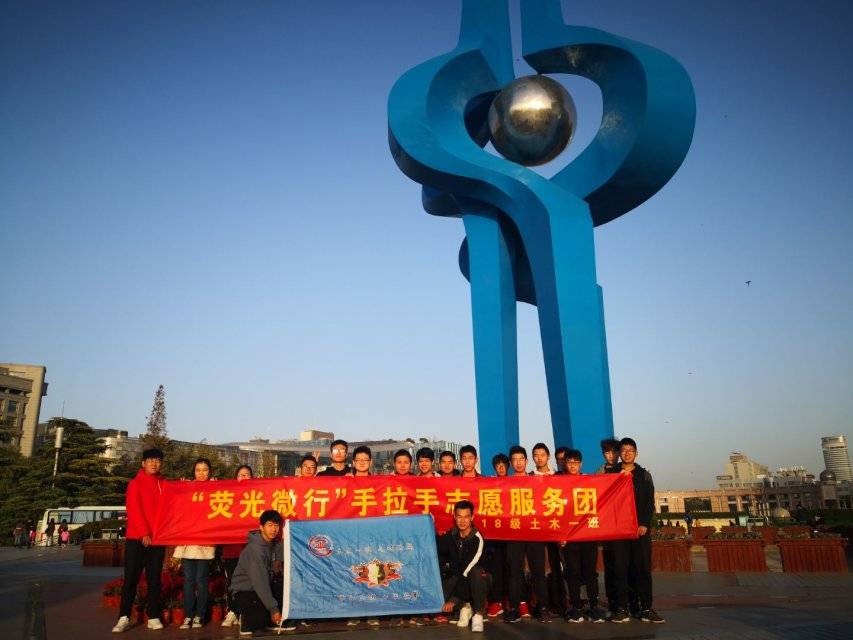 土木一班"荧光微行"手拉手志愿服务队伍整装待发,全体成员抵达济南泉城广场展开志愿活动。