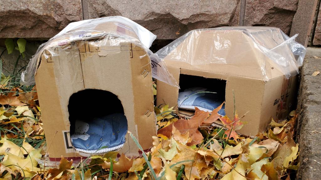 动物保护协会的工作人员一起,完成猫窝放置工作。在保证安全的情况下,每位同学都有亲手放置猫窝的机会。本次活动总共在八处位置放置20余个手工制作的猫窝,为流浪猫提供了一个温暖的家。